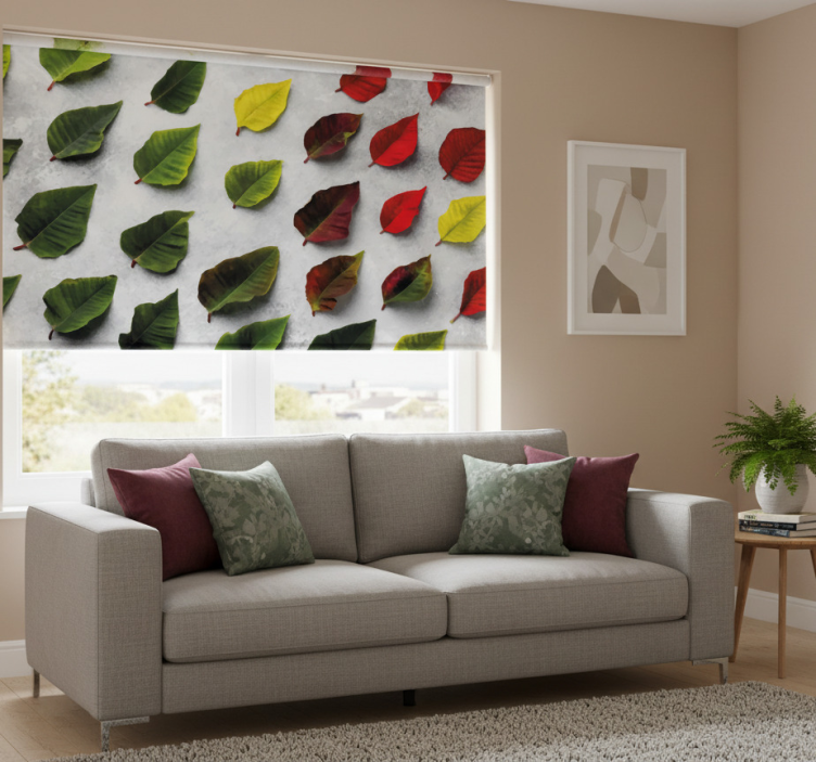 Referenz: E8613Verleihen Sie Ihrem Wohnzimmer mit unserem Rollo Wohnzimmer mit bunten Blättern im Blick eine fröhliche und lebendige Atmosphäre! Dieses dekorative Design besticht durch seine bunten Blätter, die sanft über den Stoff drapiert sind und jedem Raum eine frische Note verleihen. Die harmonischen Farben und das verspielte Muster bringen die Natur direkt in Ihr Zuhause und schaffen eine einladende Stimmung.