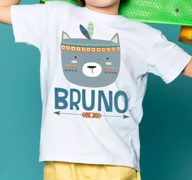 Referenz: T4968Dieses Design zeigt ein adorables Bärengesicht mit tribalen Elementen, hervorgehoben durch lebendige Farben und einen personalisierten Namen. Es strahlt eine fröhliche Stimmung aus, die perfekt für Kinder ist. Die Komposition ist ansprechend und visuell ansprechend, was es zu einer idealen Wahl für die Kleinen macht.