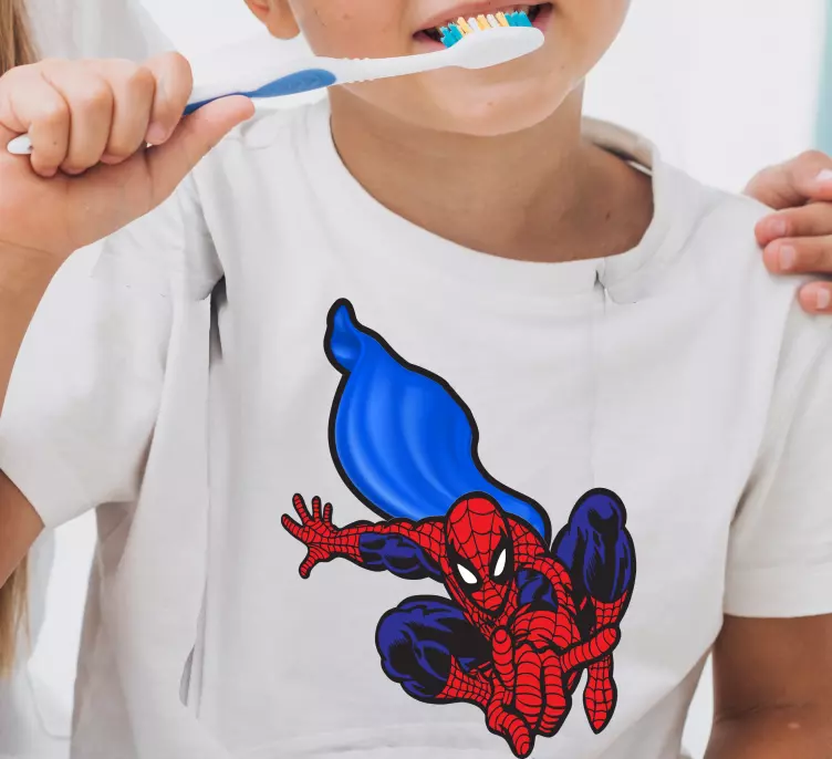 Entdecken Sie das aufregende Kinder T Shirt Spiderheld Abenteuer, das mit einem lebendigen Comic-Design begeistert! Diese farbenfrohe Illustration zeigt einen mutigen Helden mit einem blauen Umhang und einer Spinne, die zusammen in einer spielerischen Aktion stecken. Kinder werden es lieben, in diesem T-Shirt zu spielen und ihre Abenteuer zu leben!