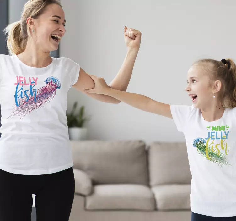 Referenz: T5235Dieses lebhafte Bild zeigt eine Mutter und Tochter, die fröhliche Momente teilen, beide in passenden Oberteilen mit lebhaften Quallenmotiven gekleidet. Das verspielte Design hebt ihre Bindung hervor und schafft eine lustige, bunte Atmosphäre, die perfekt ist, um Liebe und Zusammengehörigkeit auszudrücken.