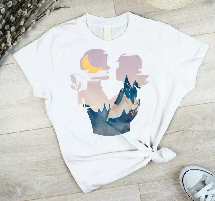 Entdecken Sie die bezaubernden Mutter Tochter T-Shirts Silhouette der Verbundenheit, die mit einem einzigartigen Design auftreten, das Elemente der Natur und Liebe vereint. Die kunstvolle Illustration zeigt eine Mutter und Tochter in eleganten Silhouetten, umgeben von einem Mond und majestätischen Bergen, die Zärtlichkeit und familiäre Bindung verkörpern. Diese T-Shirts sind mehr als nur Kleidung; sie sind ein Ausdruck von Liebe und Zusammengehörigkeit!