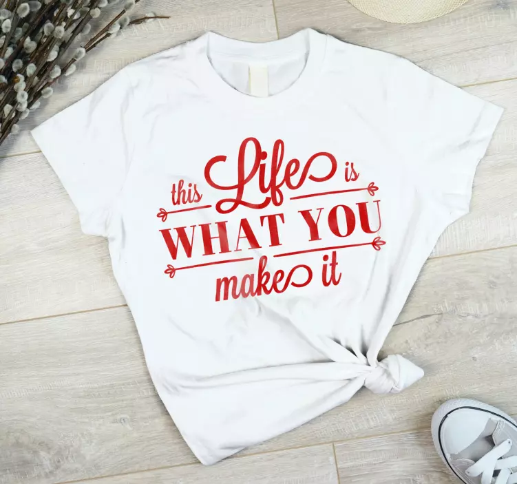Referenz: T4937Dieses Design enthält ein starkes Motivationszitat, das das Thema betont, dass das Leben das ist, was man daraus macht. Die fetten Buchstaben und lebendigen Farben ziehen die Aufmerksamkeit auf sich und machen es zu einer ausgezeichneten Wahl für legere Kleidung, um Positivität zu inspirieren.