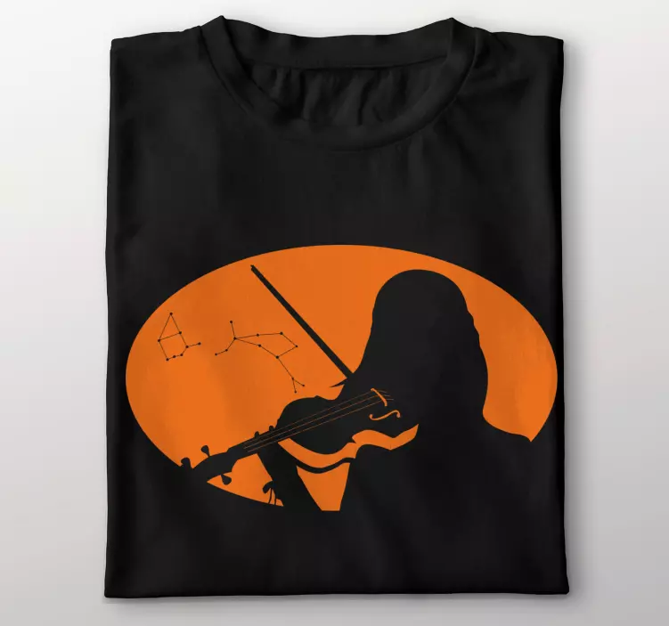 Referenz: T4530Dieses auffällige Design zeigt die Silhouette eines Violinisten unter einem sternenübersäten Himmel mit Konstellationen im Hintergrund. Der lebendige orangefarbene Kreis kontrastiert wunderschön mit dem schwarzen Stoff und macht es zur perfekten Wahl für Musikliebhaber. Ideal für besondere Anlässe oder Freizeitkleidung.