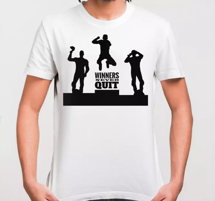 Referenz: T4890Dieses Design präsentiert einen kraftvollen Motivationssatz zusammen mit Silhouetten von triumphierenden Figuren in Aktion. Die Bilder fangen das Wesen von Beharrlichkeit und Erfolg ein und sind ideal für Enthusiasten, die Erfolge feiern. Der Schwarz-Weiß-Kontrast verleiht jedem lässigen Outfit eine mutige Aussage.