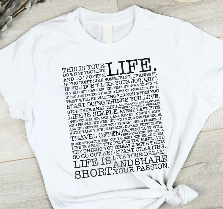 Referenz: T4871Dieses Design enthält eine inspirierende Botschaft, die Einzelpersonen ermutigt, ihrer Leidenschaft zu folgen und die Möglichkeiten des Lebens zu ergreifen. Der fettgedruckte Text verstärkt das motivierende Thema, zieht Aufmerksamkeit auf sich und fördert eine positive Denkweise. Perfekt für diejenigen, die Ermutigung durch tragbare Ausdrucksformen suchen.
