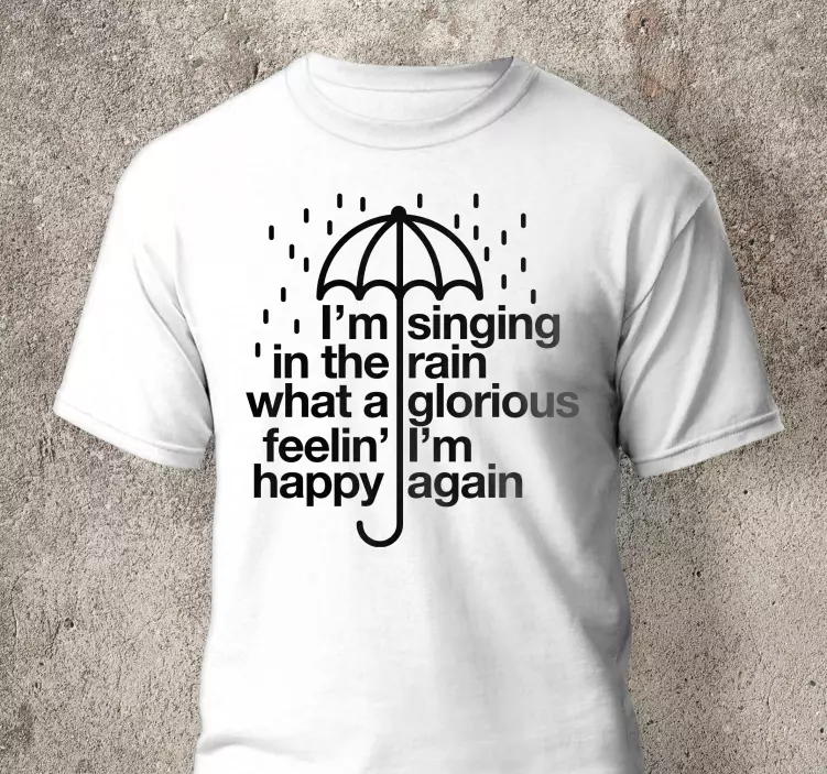 Referenz: T4934Dieses Design zeigt einen fröhlichen Regenschirm, umgeben von Regentropfen, ergänzt durch aufmunternden Text. Es fängt einen freudigen Geist ein und ermutigt zur Positivität, selbst bei trübem Wetter. Die stilvolle Typografie verleiht eine verspielte Note und macht es perfekt für alle, die ihre Liebe zum Leben und zur Musik ausdrücken möchten.
