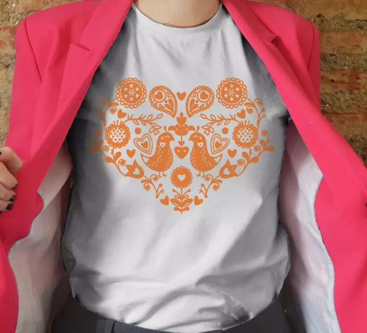 Dieses Original T-Shirt mit Herzmuster Vögel ist ein wahres Kunstwerk, das mit einem aufwendigen Design begeistert. Die Kombination aus folkloristischen Elementen und traditionellen Motiven wie Vögeln und Blumen vermittelt ein Gefühl von Liebe und Naturverbundenheit. In einem eleganten Schwarz-Weiß-Kontrast kommen die Details des Herzmusters besonders gut zur Geltung und machen dieses Shirt zu einem Blickfang für jeden Anlass!