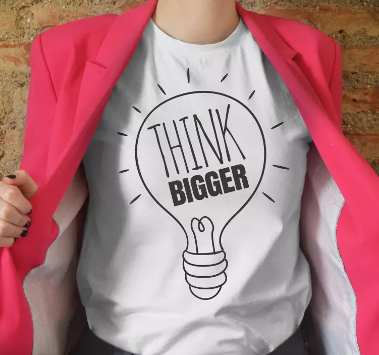 Referenz: T4862Dieses Design zeigt eine Glühbirne mit dem Satz 'Think Bigger' in fetten Buchstaben. Die Bildsprache weckt ein Gefühl von Inspiration und positivem Denken, indem sie einfache, aber kraftvolle visuelle Elemente verwendet, die mit einem motivierenden Thema resonieren.