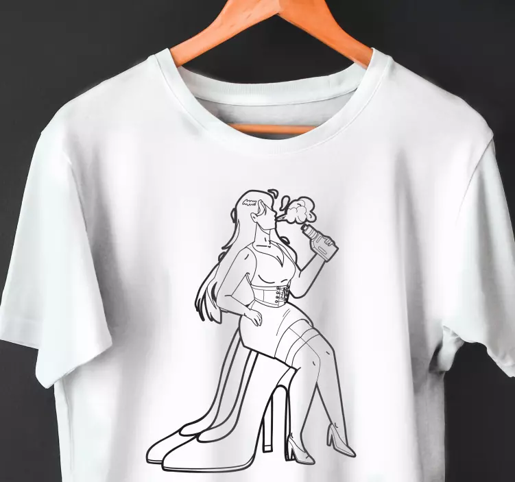 Referenz: T4959Umarmen Sie Ihren Stil mit dieser schicken Illustration, die eine selbstbewusste Frau zeigt, die elegant auf hohen Absätzen sitzt und aus einem Getränk nippt. Das auffällige Design fängt eine Mischung aus Kühnheit und Weiblichkeit ein und macht es zu einer trendigen und auffälligen Wahl für jeden Anlass.