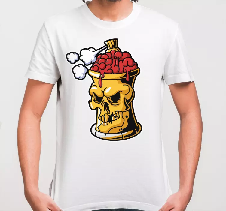Referenz: T4480Dieses Design zeigt eine auffällige gelbe Tasse, die mit einem Gehirn- und Schädelsymbol verziert ist. Roter Sirup tropft vom Gehirn, während Rauch von oben aufsteigt und eine gruselige Ästhetik schafft, die perfekt für Halloween ist. Die lebendigen Farben und die intricaten Details erhöhen die visuelle Anziehungskraft.