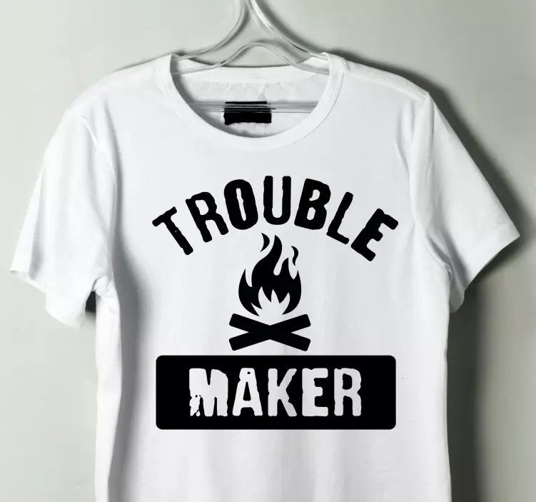 Referenz: T5448Dieses auffällige Design zeigt fetten Text mit der Aufschrift 'Trouble Maker', begleitet von Flammen- und Lagerfeuersymbolen. Es ist perfekt für diejenigen, die einen Spaß- und Abenteuergeist umarmen. Der Kontrast von Schwarz auf Weiß fügt ein Element der Aufregung hinzu und zieht mühelos die Aufmerksamkeit auf sich.