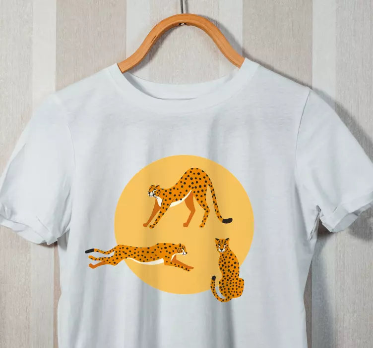Referenz: T4493Dieses trendige Stück zeigt ein entzückendes Trio von animierten Geparden in verspielten Posen, vor einem lebhaften orangen Kreis. Das fröhliche Design spricht Kinder an und macht es zu einer charmanten Wahl für junge Tierliebhaber. Ideal für legere Ausflüge oder verspielte Abenteuer.