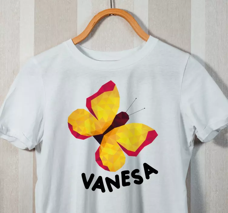 Referenz: T4993Dieses charmante Design zeigt einen lebhaften Schmetterling mit einer strahlenden Mischung aus Gelb- und Rottönen. Die geometrischen Formen verleihen einen modernen Touch, während die markante Schriftart des Namens seine persönliche Anziehungskraft verstärkt. Perfekt, um eine fröhliche und verspielte Stimmung zu zeigen.