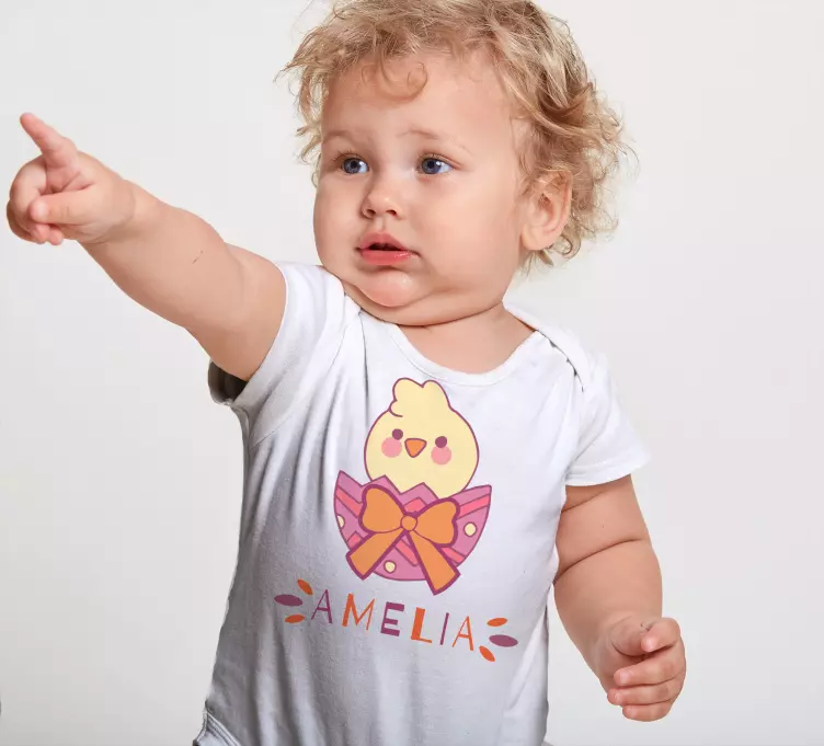 Entdecken Sie unser T-shirt baby süßes küken mit schleife, das mit einem bezaubernden Design begeistert! Das kreative Motiv zeigt ein niedliches Küken mit einer verspielten Schleife, das aus einem bunten Ei schlüpft. Diese personalisierbare und anpassbare Babybekleidung ist ideal für kleine Tierliebhaber und bringt garantiert ein Lächeln auf die Gesichter. Das T-shirt kombiniert Komfort mit einem fröhlichen und farbenfrohen Look, perfekt für jeden Tag!