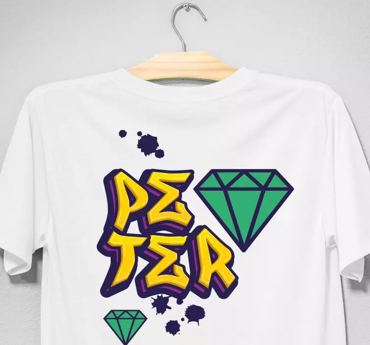 Referenz: T5428Dieses lebendige Design präsentiert den Namen 'Peter' in fetten, stilisierten Buchstaben neben einer grünen Diamantgrafik. Die verspielten Elemente umfassen farbenfrohe Spritzer, die die zeitgenössische Atmosphäre verstärken. Perfekt für die Freizeitkleidung, kombiniert es einzigartige Kunstfertigkeit mit einer persönlichen Note.