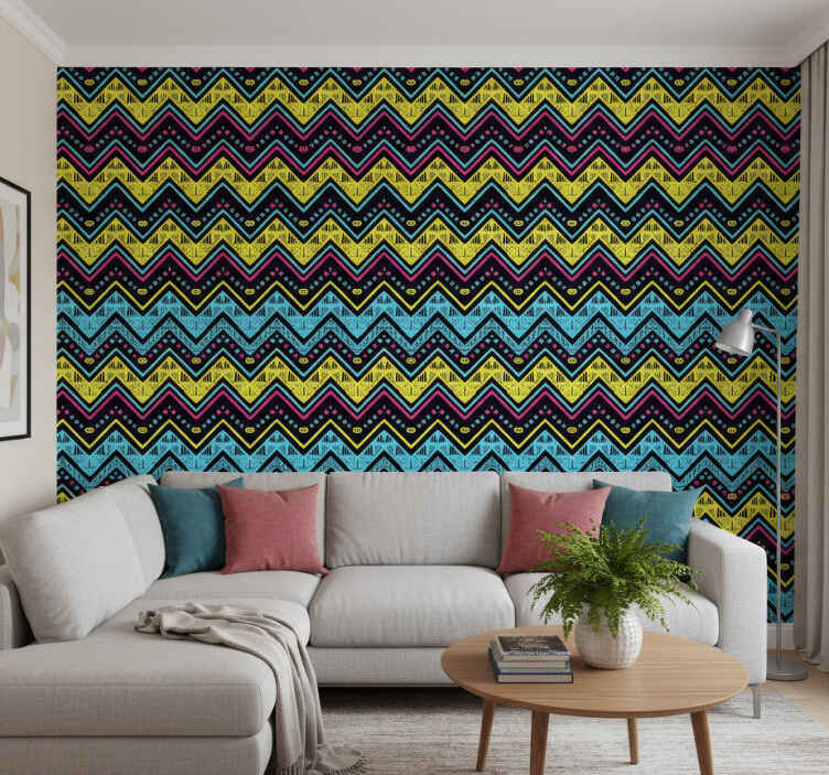 Die Anbringung der Tapete geometrisch mit lebhaftem chevron-muster ist einfach und unkompliziert. Tragen Sie den Klebstoff auf die Wand auf und verwenden Sie eine Rolle oder einen Pinsel, um die Tapete gleichmäßig zu befestigen. Ein Cutter hilft Ihnen, Überstände präzise zu schneiden und ein perfektes Finish zu erzielen.