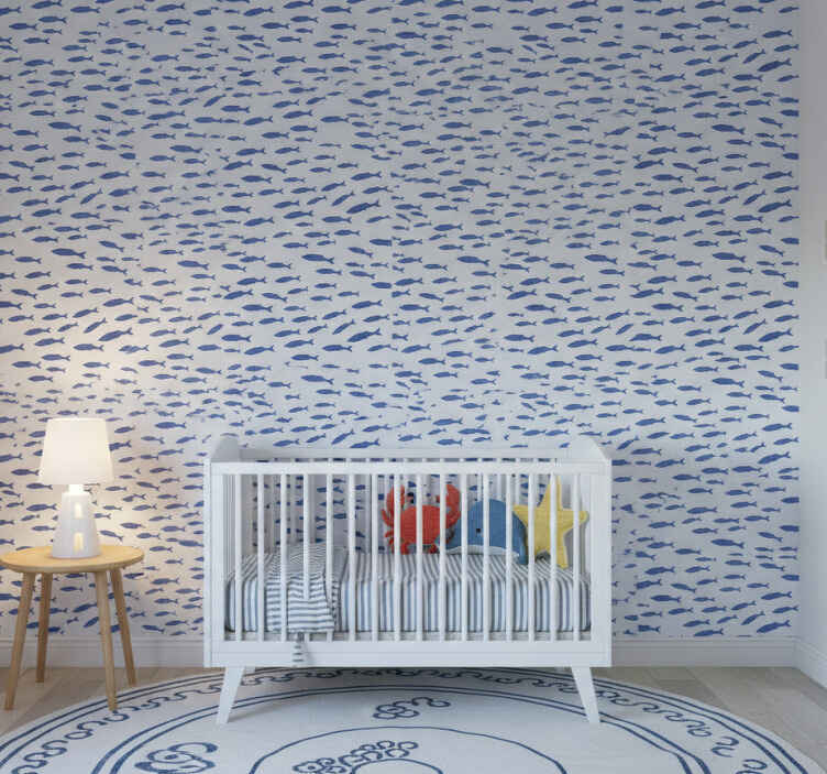 Tapete kinderzimmer mit blauem fischmuster auf weiß