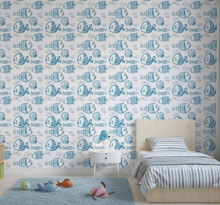 Tapete kinderzimmer mit blauen fischen auf weiß