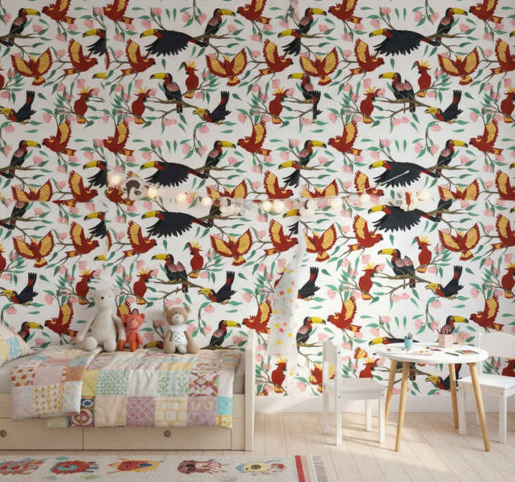 Tapete kinderzimmer mit fliegenden papageien und tukanen