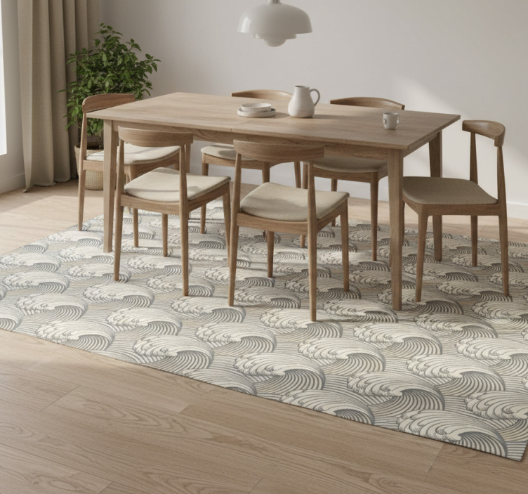 Der Vinyl Teppich Esszimmer Vintage Wellen ist die perfekte Ergänzung für Ihr Zuhause, wenn Sie eine stilvolle und zugleich funktionale Lösung suchen. Sein elegantes Design fügt sich harmonisch in jede Einrichtung ein und verleiht Ihrem Esszimmer einen Hauch von Vintage-Charme. Durch die Kombination aus Ästhetik und Praktikabilität wird dieser Teppich zum Blickfang in Ihrem Raum. Er schafft eine einladende Atmosphäre, die Gäste und Familie gleichermaßen begeistert!